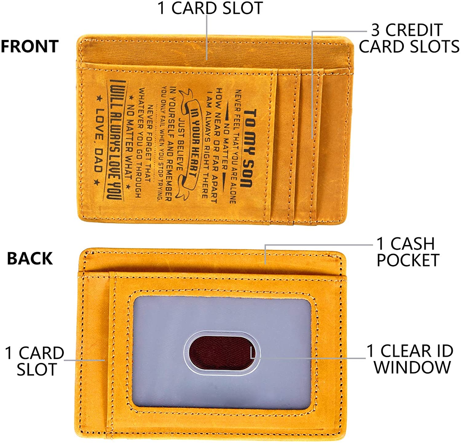 • ★ Slim Design but Sufficient Capacity. 5 card slots, 1 clear ID window and 1 cash pocket. Enough place for cash, important bills and cards. Help your son store them together and there is no way to forget them somewhere anymore. Meaningful wallet for him your young man as 16th, 17th, 18th, 21st birthday gift, graduation keepsake, Christmas stocking stuffers...