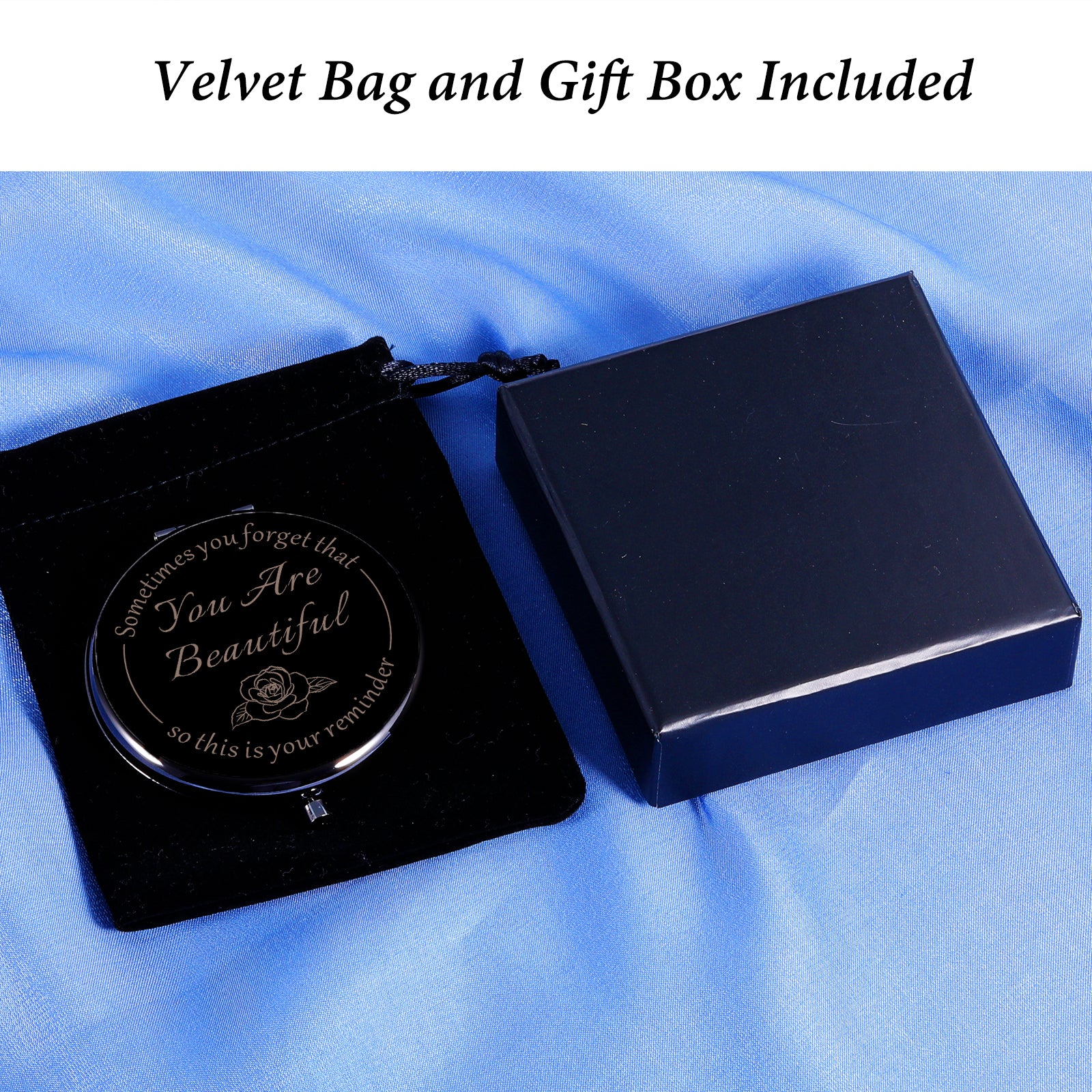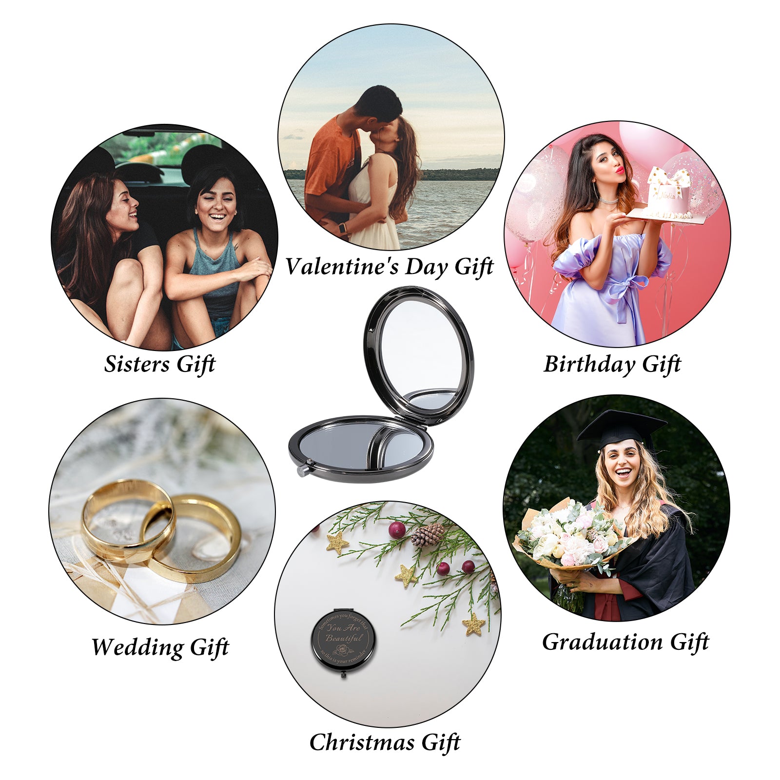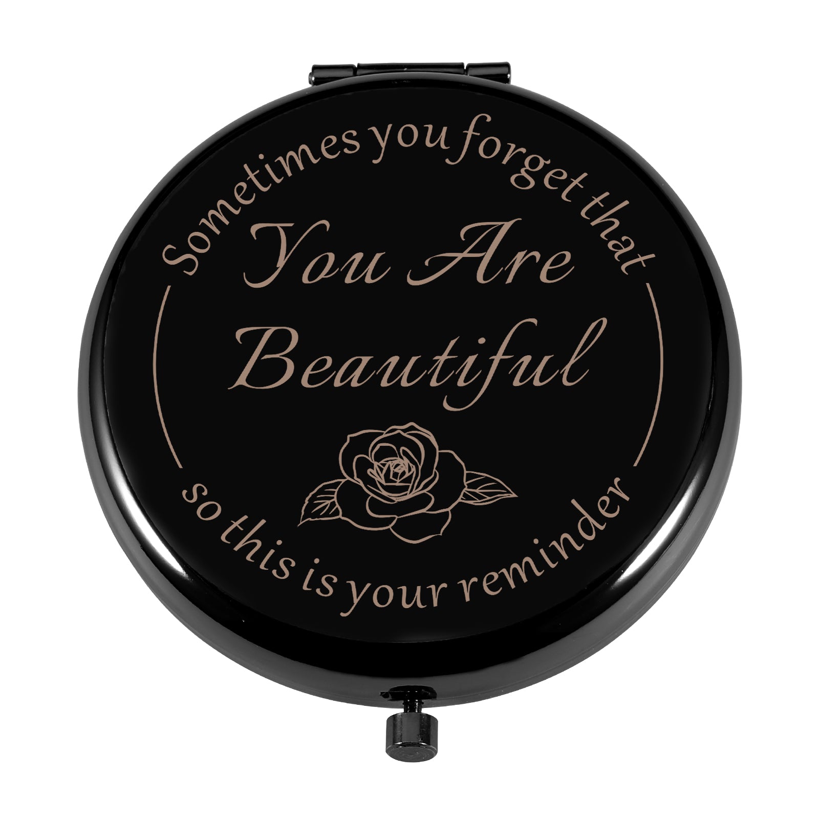 - Birthday Gifts for Women-- This is a compact makeup mirror laser engraved with “Sometimes you forget that You Are Beautiful so this is your reminder”. An elegant and sweet gift as birthday gift, long distance gifts, retirement gifts for women. Your best friends, soul sister, family member, colleague friend can feel your love and support no matter at home, the office, or traveling when looking in the mirror.