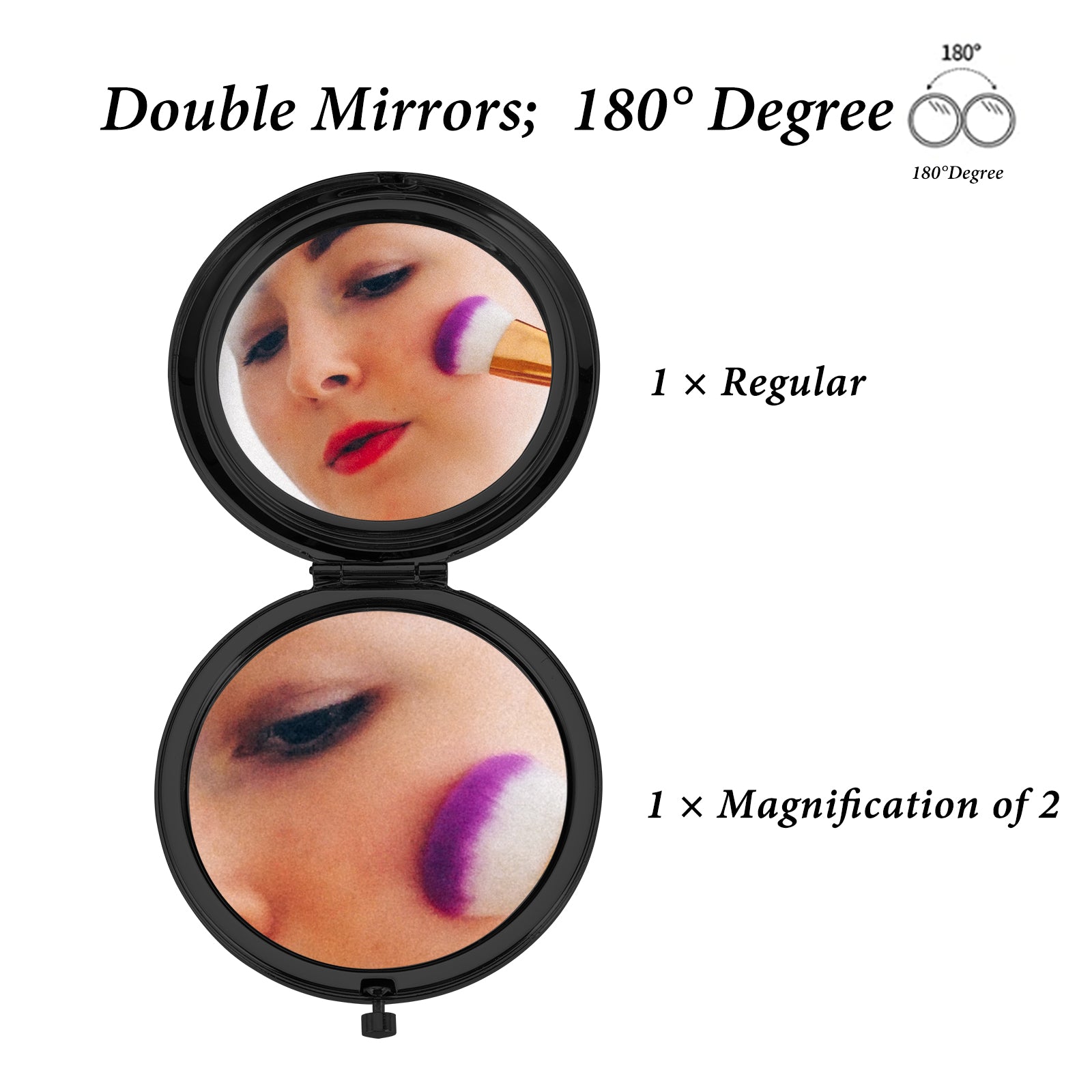 - Quality and Details-- Size: 2.6*2.8 inch; thickness: 0.4 inch. 1 x gorgeous black compact mirror, including a regular mirror and a 2x magnifying mirror, suitable for makeup. Wrapped in a velvet bag and a gift box, ready for a nice presentation. Made of high-quality alloy, light but without losing texture, clear and shiny, cute and pretty. If you have any question, please feel free to contact us and we will do better.