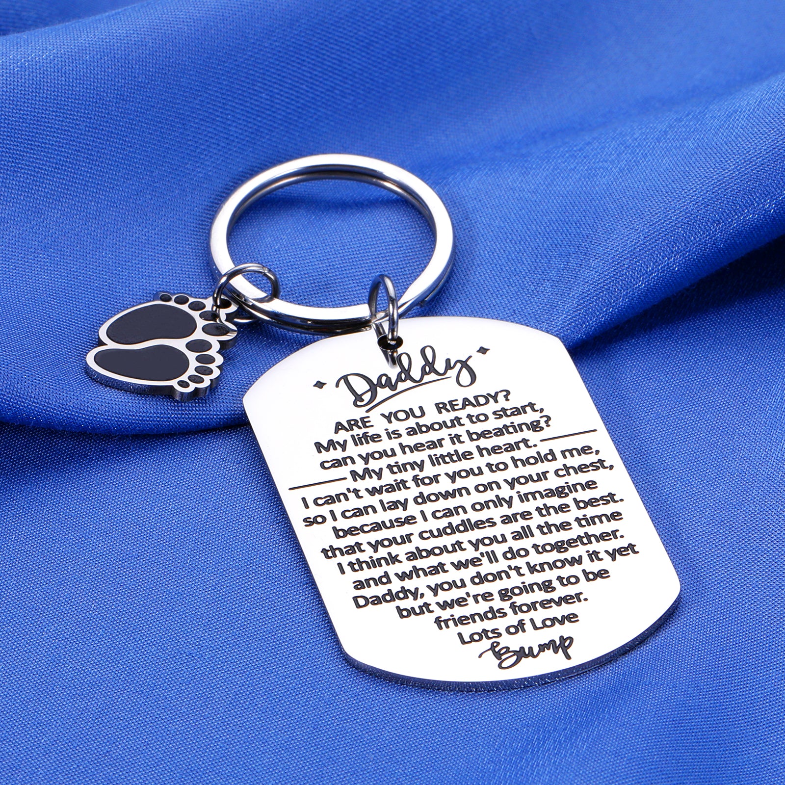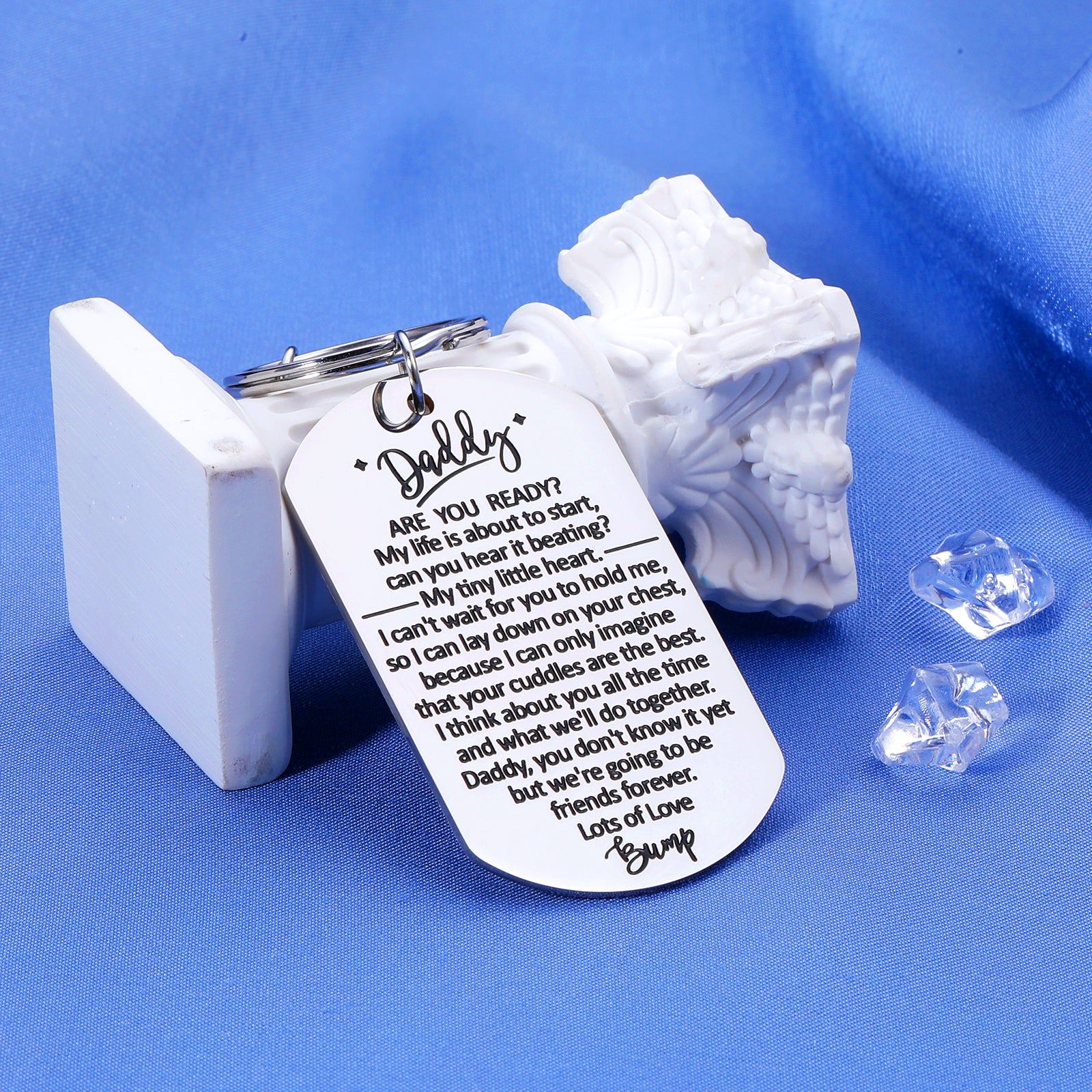 New Dad Gifts for Men-- Unique key chain clearly engraved with sentimental words “Daddy, ARE YOU READY? My life is about to start, can you hear it beating? My tiny little heart. I can't wait for you to hold me, so I can lay down on your chest, because I can only imagine that your cuddles are the best. I think about you all the time and what we'll do together. Daddy, you don't know it yet but we're going to be friends forever. Lots of Love, Bump”.